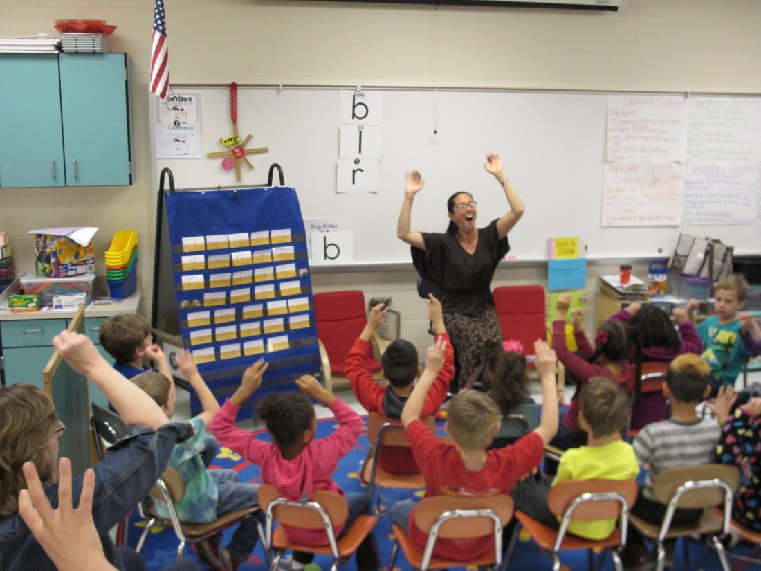 Moore had illustrated these “steady beat” concepts to teachers of both schools in a professional development workshop Wednesday evening, and then employed them in select classrooms so the teachers could see the process in action. Her assertion is that exploring a book through “participatory chanting” creates both a personal and shared learning experience for students that builds enthusiasm for reading, while increasing individual comprehension.