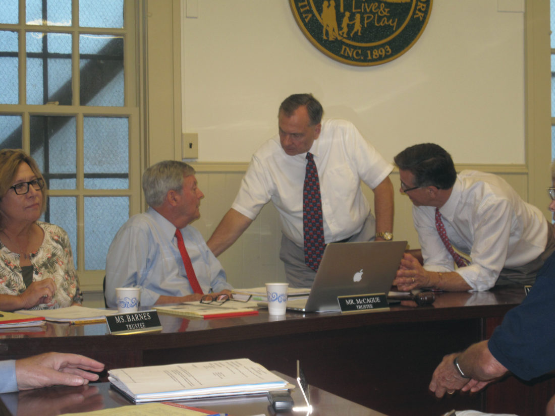 - From left, Lakewood trustees Ellen Barnes, Ted McCague, Randy Holcomb and Doug Schutte talk during a work session before Tuesday’s village board meeting. P-J photo by Eric Zavinski