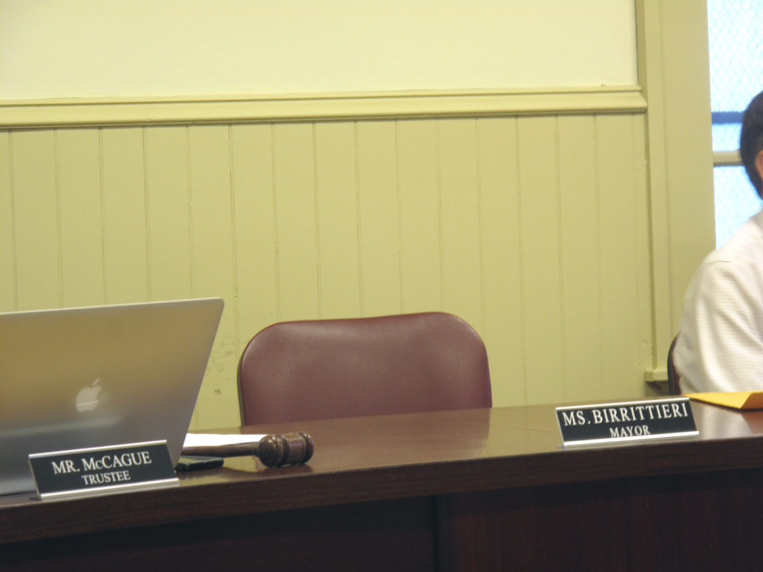 - Former Mayor Cara Birrittieri’s chair sits empty following her resignation Friday. She resigned due to personal obligations, and the village board unanimously accepted her resignation. Village Attorney John LaMancuso will advise the board on how to proceed to find a new mayor. P-J photo by Eric Zavinski