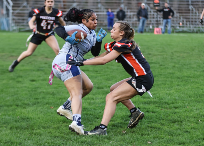 FREDONIA — Emma Perry ran seven times for 109 yards and three touchdowns to lead Fredonia to a 54-0 shutout of Lackawanna in Division 4 flag football Tuesday at the Orange Bowl.