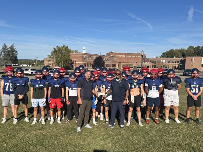 LAKEWOOD - The Lakewood Community Development Corporation recently presented a $1,000 check to the Southwestern/Frewsburg Football Team in recognition of its volunteer efforts and support during the inaugural Rock the Lake Summer Concert Series at Hartley Park.