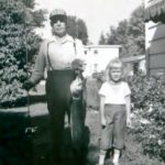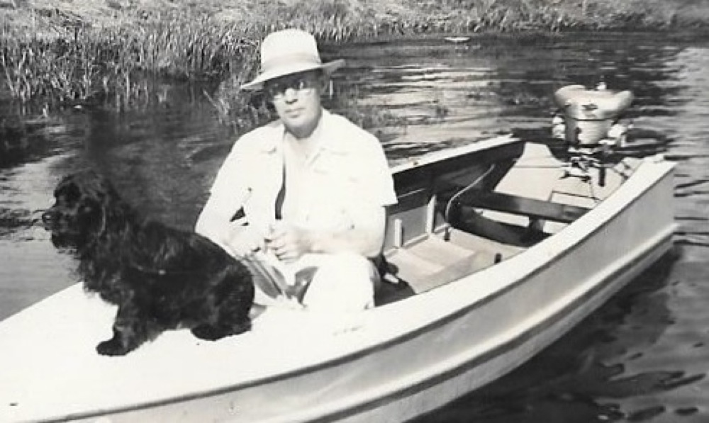 - Carl Forsberg with Chubby in his first boat, 1945.