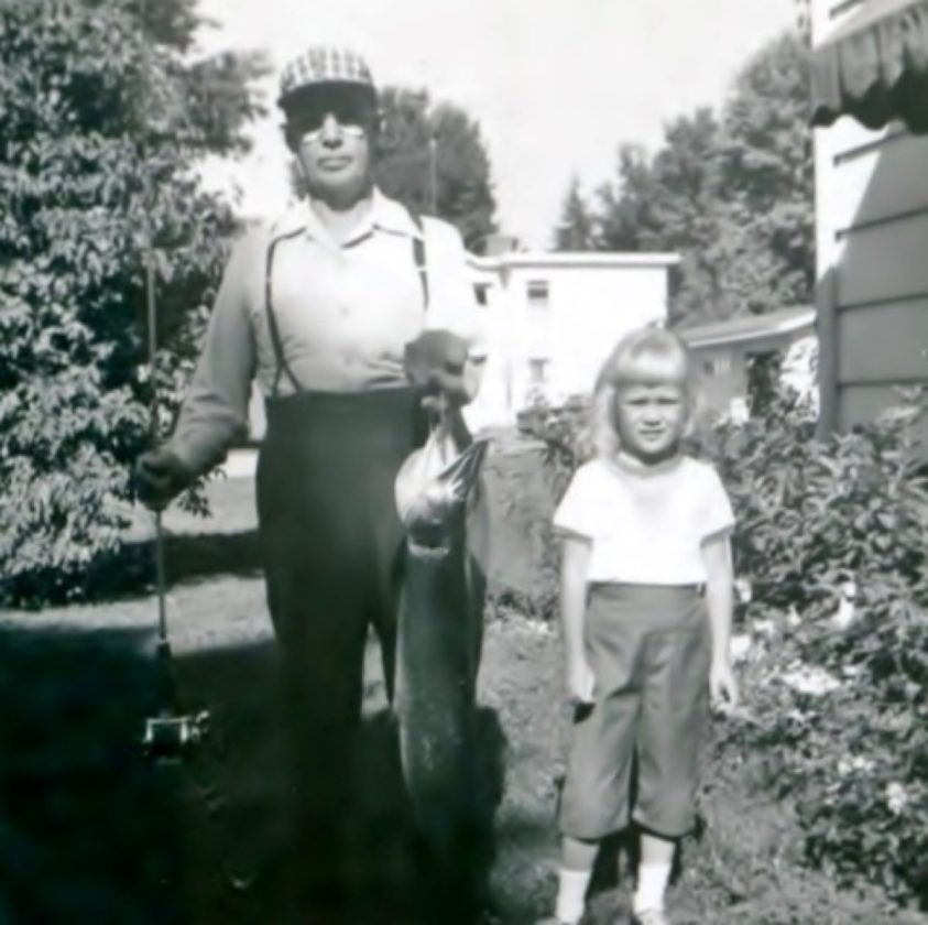 Grandpa Forsberg with Vicky and a muskie, 1960.