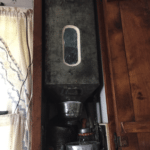 Lucile built the kitchen cupboards and countertop in her home, continuing them into the dining room to give her adequate storage and counter space. The flour bin with built-in sifter, from her Grandmother Colburn’s Hoosier cabinet has had a place of honor in special cabinets she has built in each of her six kitchens.
