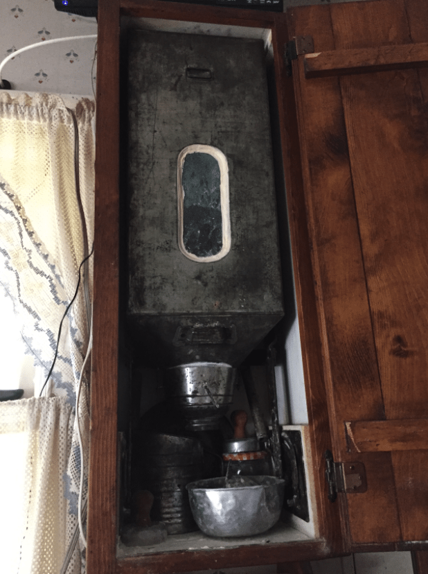 - This flour mill and sifter came from Lucile Frost’s grandmother’s Hoosier cupboard. Lucile Frost has built a cabinet for it in each of her six kitchens.