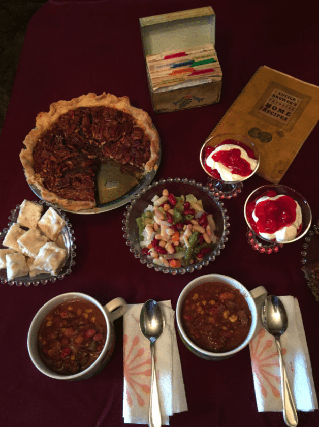 - White Fudge, Cowboy Chili, Pecan Pie, Three-Bean Salad Plus and Cherry Cream Cheese Parfaits are pictured. A much-loved, much-used cookbook splattered with memories from Ethel Colburn, Lucile Frost’s grandmother. The recipe box holds Lucile’s favorite recipes.