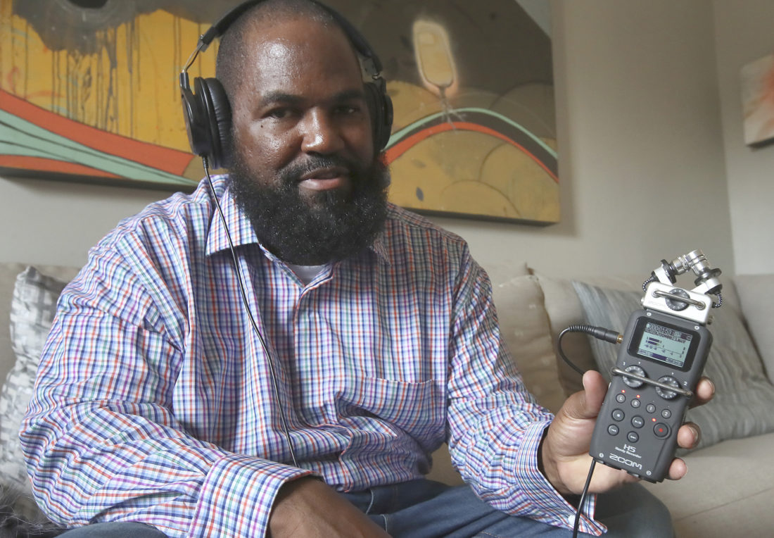 In this Dec. 19, 2018, photo, Earlonne Woods shows recording equipment similar to what he used in San Quentin State Prison to produce his podcasts, during an interview in Oakland, Calif. Woods, 47, was recently released from San Quentin prison after California Gov. Jerry Brown commuted his 31-years-to-life sentence for attempted armed robbery. Brown cited Woods’ leadership in helping other inmates and his work at “Ear Hustle,” a podcast he co-hosts and co-produces that documents everyday life inside the prison. “Ear Hustle” launched in 2017. Its roughly 30 episodes have been downloaded a total of 20 million times by fans all over the world. AP photo