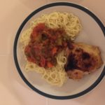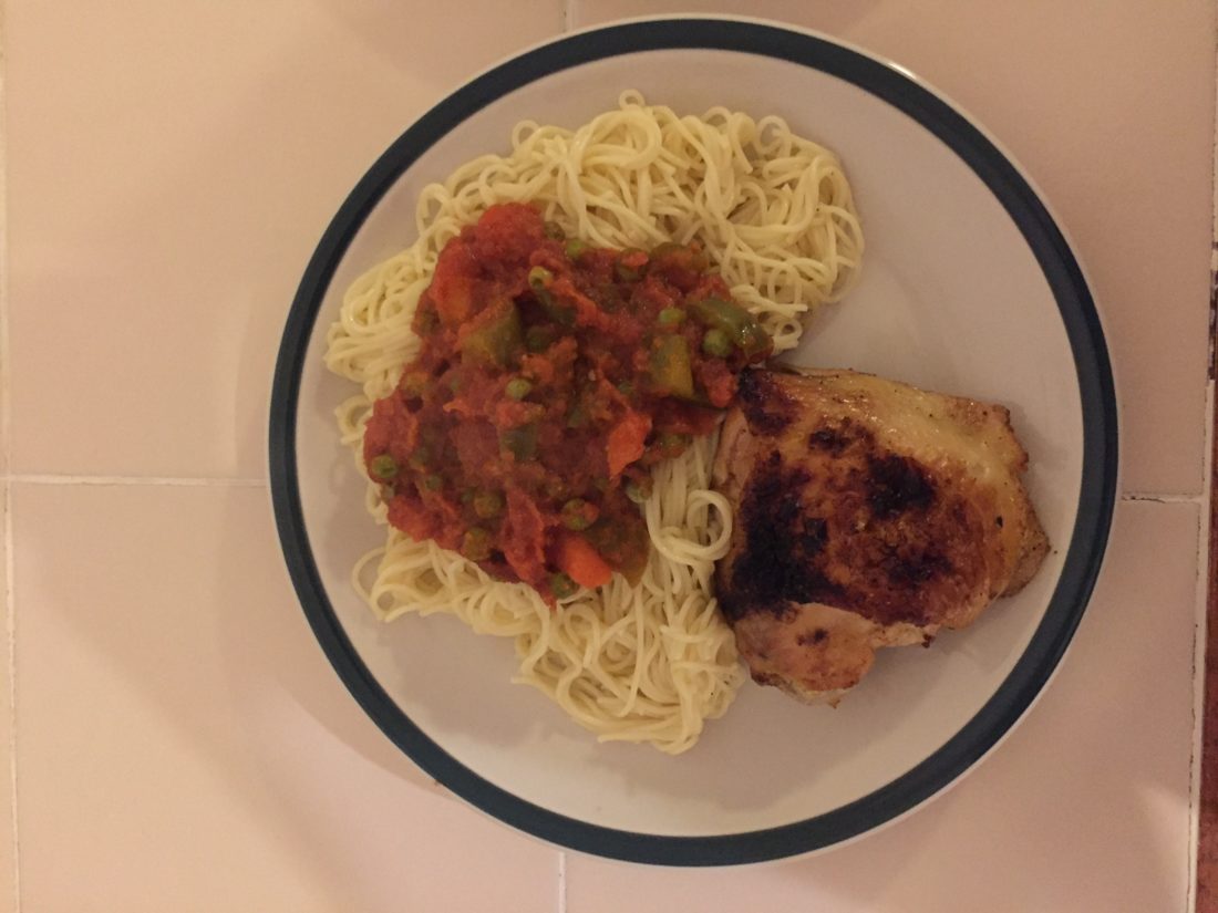 - Spaghetti topped with Beans Stew compliments Roasted Chicken on this plate.