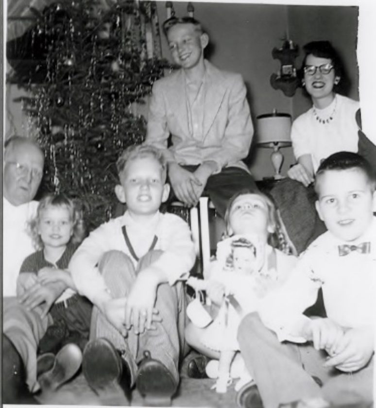 Johnson family Christmas, 1953. Grandpa Ben, Sandy, cousins Al Lager, Martha Jean and Chuck Larson, (back row) cousin Larry Nelson and cousin Nancy Larson. Johnson family archives