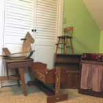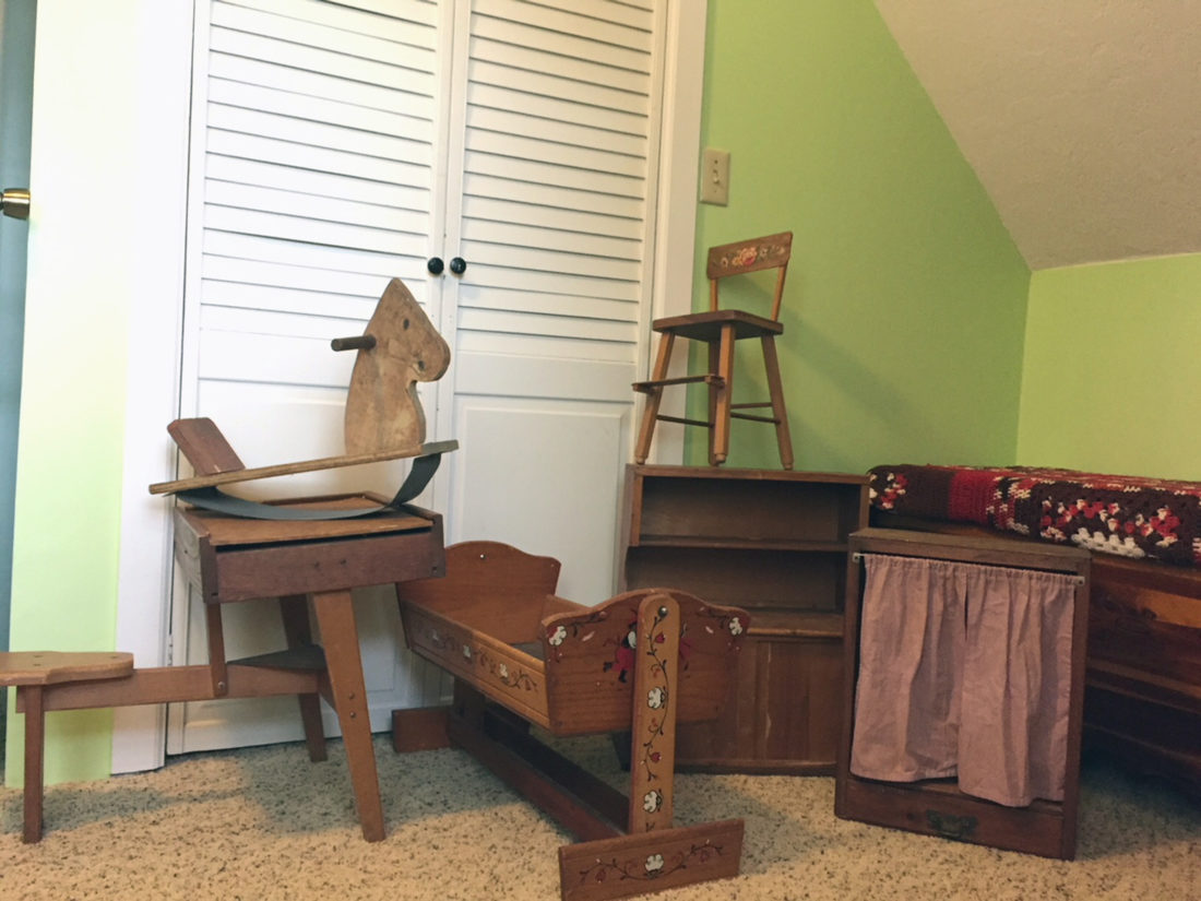 Margaret Milford’s home is filled with warm fuzzy memories. She is able to keep her childhood memories close to her heart thanks to her parents, Ernest and Betty Chubb, who saved many toys and items that held special meaning for her, after she left home. Among these is the large collection of children’s furniture and doll-sized pieces her father built for Margaret and her sister, Carol. The special collection is made up of a desk with attached seat, a rocking horse, two hutches and two cupboards covered with a curtain made by the girls’ mother. Two cradles, one low with rockers and the other swinging from a tall stand and a high chair make up the doll-sized collection. Over the years, the sisters have shared the furniture, moving it from one house to the other. The older sister’s daughters used the pieces, while Ms. Milford was raising two sons, but the furniture is now in her possession for her granddaughter to use.