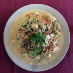 In frying pan, saute garlic in olive oil. Add peppers, onions and chicken. Cook until nearly done. Add Tequila and cook until it has reduced about 50 percent. Add cream, butter, parmesan cheese and salt and pepper. Add more cream, if not creamy. Serve over linguine.