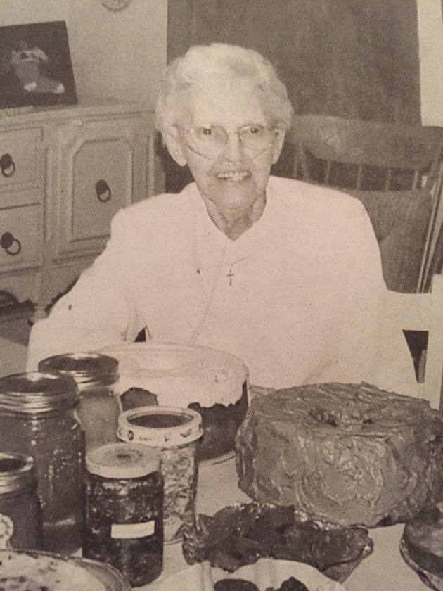 - The late Marjorie Ebert displays cakes and jars of canned goods like the ones for which she won blue ribbons at the Chautauqua County Fair for many years. Photo by Beverly Kehe-Rowland