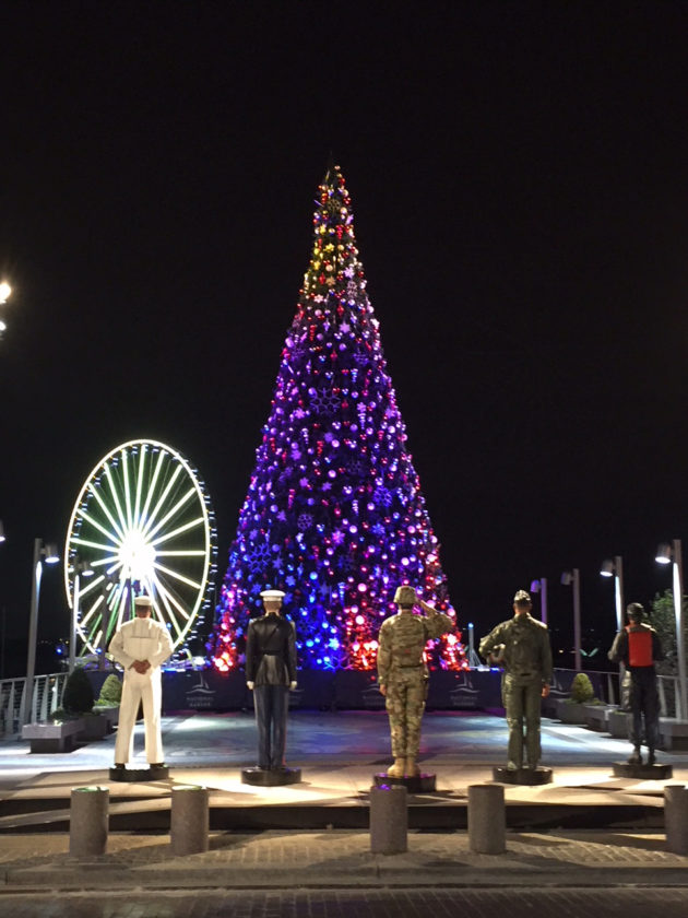 On the waterfront at the foot of our street was a mammoth ever-changing electronic Christmas tree with various ornament-shapes outlined with lights. The colors changed as various Christmas songs and patriotic tunes played. The tree was situated in front of a row of saluting statues of men in uniform representing the five branches of the U.S. Armed Forces. Photo by Beverly Kehe-Rowland