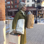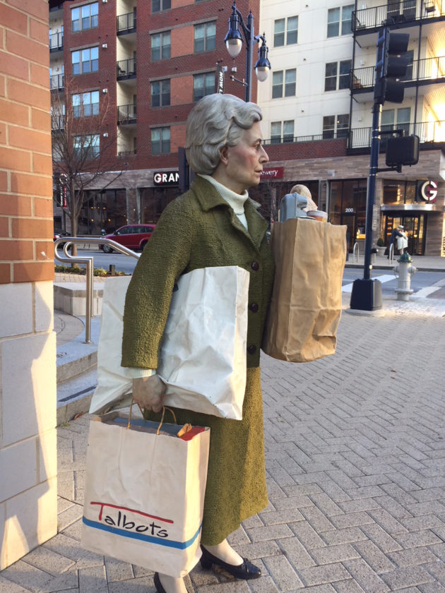 - A life-like statue of an elderly woman in a knee-length winter coat, wearing a scarf while holding several packages was one of the interesting sights in the National Harbor. Photo by Beverly Kehe-Rowland