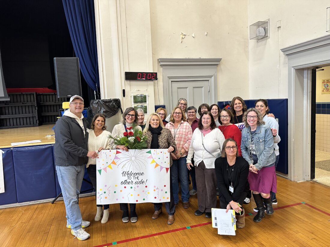 Love School Celebrates Cammarata_1: Adriana Cammarata stands with former coworkers and retirees who surprised her during a POP Assembly on Dec. 8 to celebrate her 30-year career at Love. Cammarata retired on Dec. 19.