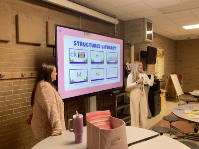 - First grade teachers Sarah Josephson and Sophia Walter demonstrate a standard first-grade structured literacy lesson for their students’ families.