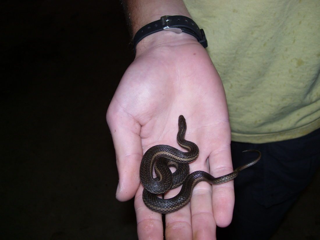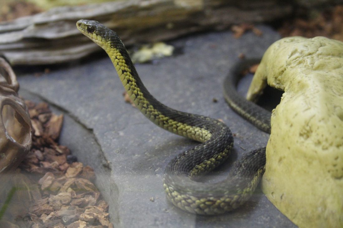 Garter snakes are actually helpful to humans, as they eat things like rodents that can harm humans and leeches if they live near water. There are two types of garter snakes found in this area: the common garter snake and the short-headed garter snake. The common garter snake is the most common snake in the area, and lives in lawns, fields and the edges of woodlands. They can be up to 2 feet long, with a diet consisting of insects, slugs, worms and the occasional small frog or mouse if they get lucky. The short-headed garter snake reaches an adult size of 3-4 feet, and has a smaller head than other garter snakes. It is usually a light gray or brown color with a light green or yellow stripe running down the center of its back. This snake is usually very docile, and eats mostly worms and sometimes small fish or amphibians.
