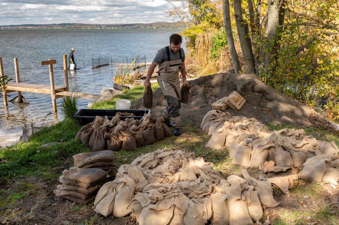 Previous surveys by CWC found that dense eelgrass beds often coincided with reduced Starry Stonewort abundance and oftentimes acted as natural barriers to its spread. Based on these observations and other research, eelgrass was selected as the ideal species for replanting. Guided by NYSDEC and other restoration projects, CWC developed a planting strategy using biodegradable burlap bags filled with a mixture of topsoil and sand. After soaking the bags to reduce transplant shock, they were then planted with healthy eelgrass shoots. Once sealed, the bags were transported by jetsled and placed on the lakebed to form the perimeter of each planting plot. Inside the boundaries, additional eelgrass plants were installed directly into the substrate as bare-root transplants. This layout stabilizes sediment, buffers against waves and ice scour, and protects the young plants during their early growth.