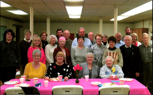 Pilgrim Memorial and First Congregational United Church of Christ recently held a 100th birthday luncheon for Anna Sweet, whose birthday was Feb. 10. Sweet was a valued member of the Pilgrim Women’s Group. Seated next to Anna, wearing a corsage, is her daughter, Judy Lord. The pair is surrounded by church family and friends. Anna was presented with a letter, pen and pin from Jamestown Mayor Sam Teresi.