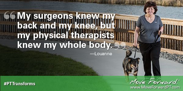 “As I look back over those almost 13 years, and three surgeries, the constant that remains is Ken Clouston and his team,” said Louanne. “My surgeons knew my vertebra column and my knee in isolation, but my physical therapist knew my whole body. It was because of this knowledge and their expertise and compassion, my life has changed. There is no doubt in my mind that without physical therapy, the quality of my life would be very different today.”