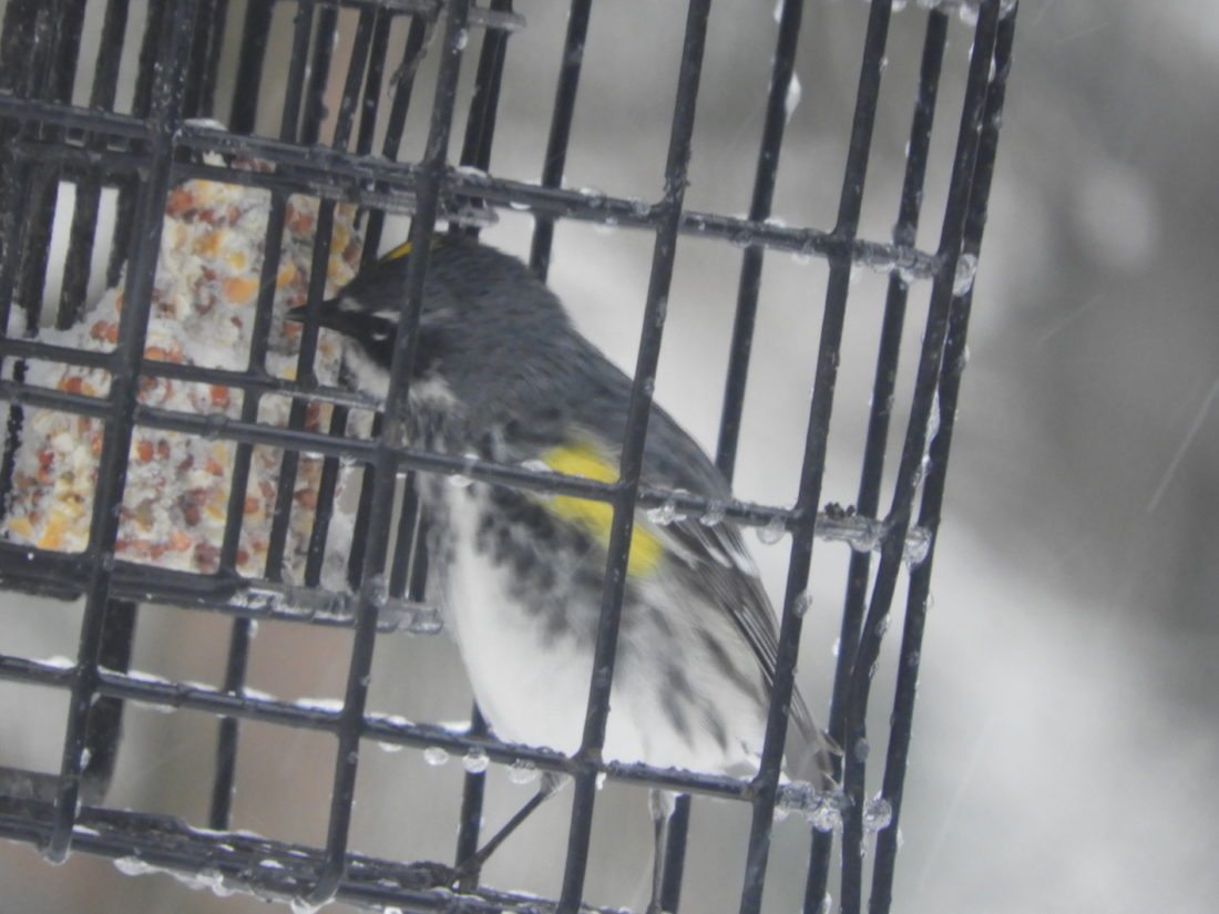 Quick glance and just two or three shots. Could that be a Golden-winged Warbler at the suet feeder? The yellow in its wings is terribly bright and striking but it isn’t a bird I feel I should know. Seems quite unlikely. If confirmed, that would be another first. (I thank patient Twan Leenders at RTPI for this correction as well: it’s a Yellow-rumped Warbler.)