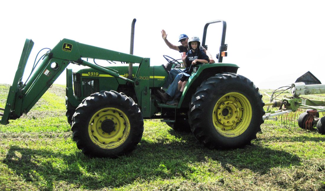 John Park and his large green tractor, hauling a hay rake, brighten the life of grandson Andrew, then age 10, a decade ago. Submitted photo