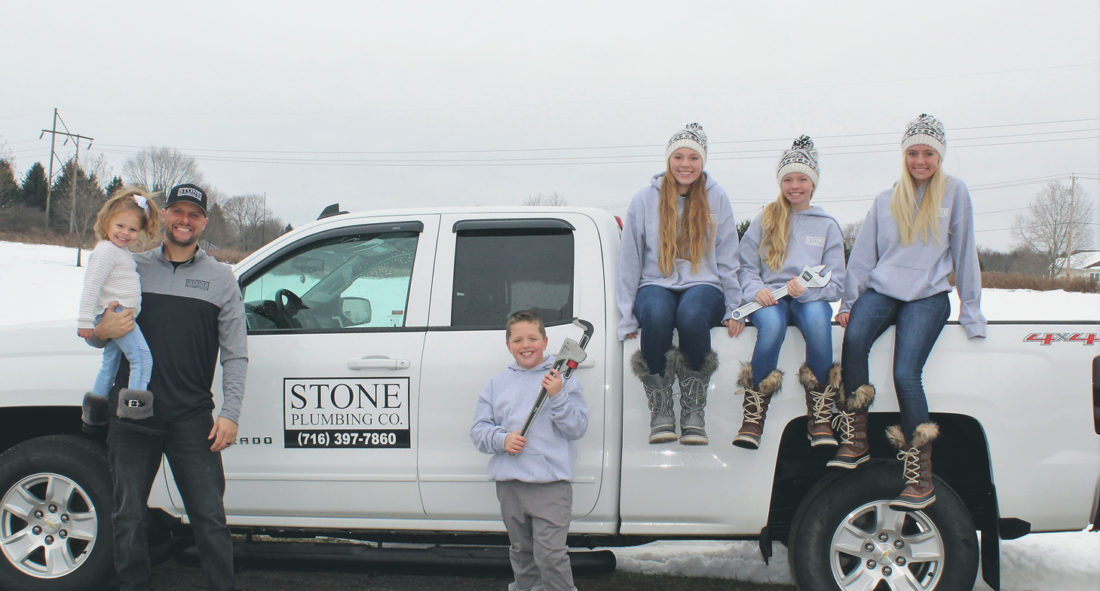 Scott Stone, owner and operator of Stone Plumbing Co., holds his daughter, Alivia, and stands in front of his business vehicle. His other four children are, from left, Isaac, Alexandra, Addison and Ava. Submitted photo