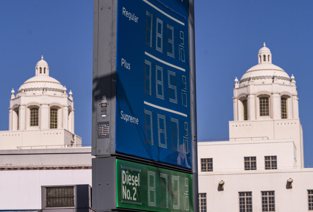 Various grades of gasoline, with prices above seven dollars per gallon, are displayed at a Chevron gas station, May 22, 2022, in downtown Los Angeles. Americans cut their spending unexpectedly in May compared with the month before, underscoring how surging inflation on daily necessities like gas is causing them to be more cautious about buying discretionary items. AP photo