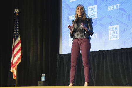 Lindsey Johnson, president of the Consumer Bankers Association, speaks during an industry conference in Las Vegas, on Monday, March 28, 2023. Johnson became president of the CBA in 2022, representing the trade and lobbying organization for the nation’s big retail banks like Bank of America, Wells Fargo, US Bank, PNC and others. Before she joined CBA, she was president of the trade association for the mortgage insurance industry. Consumer Bankers Association via AP