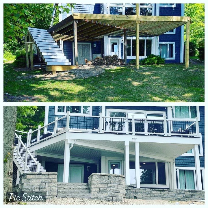 A before and after photo of the outdoor space in Bemus Point that Hanft’s Landscaping recently unveiled. Submitted photo