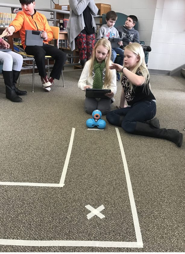 “We have a new challenge mapped out on the floor for DASH,” said Julie Livengood, Jefferson Middle School library media specialist, to a group of fifth-graders. “The challenge is to have DASH go through the maze and at each ‘x’ stop and do something that you program in your iPad. His eyes can blink, turn DASH around or say something. Remember, I want you to collaborate and talk to each to work through coding this program.”