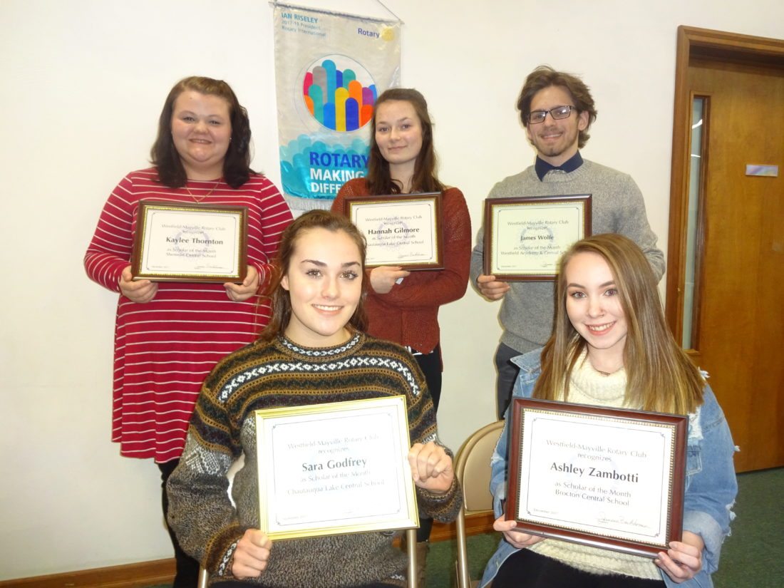Students honored include: Sara Godfrey, Chautauqua Lake Central School (month of Sept.); Ashley Zambotti, Brocton Central School (Dec.); Kaylee Thornton, Sherman Central School (Dec.); Hannah Gilmore, Chautauqua Lake Central School (Dec.); and James Wolfe, Westfield Academy and Central School (Dec.). School officials nominated the students to receive this Westfield-Mayville Rotary Club recognition.