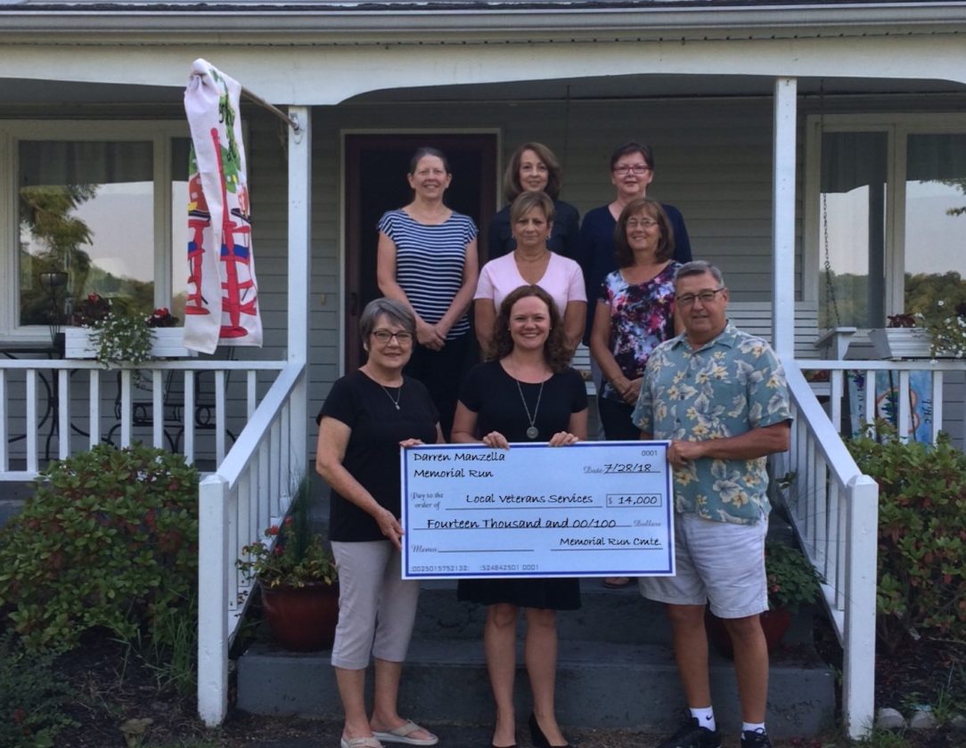 Nancy and Michael Manzella, Darren Manzella-Lapeira’s parents, present Tory Irgang, Chautauqua Region Community Foundation executive director, a check for $14,000 to be used for veterans in need. Also pictured are race committee members, Ivis Edgerton, Kathleen Thies, Cindy Orr, Pat Titus and Lynne Wysocki. Not pictured are Deanne Manzella, Terri Mundy and Michele Patterson. Submitted photo