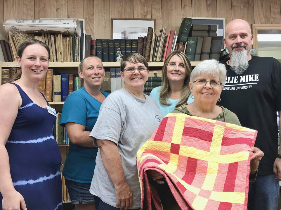 A quilt donated to be given away as part of the Suicide Prevention Run is pictured. From left are Annie RosenthalChautauqua Tapestry public relations coordinator; Melodie Paladino, Veterans of Modern Warfare Chapter 20 member and PFC DWYER Peer to Peer Pros; Brenda French, Female Veterans Dwyer Peer to Peer Program and member of Veterans of Modern Warfare Chapter 20; Cindy Reidy, PFC Joseph P. Dwyer Peer to Peer program coordinator; Anne French, presenting the quilt, and Robb Will of the Dwyer Peer to Peer Program and Veterans of Modern Warfare Chapter 20. Submitted photo