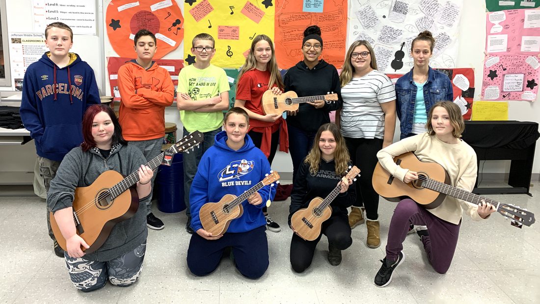 Jefferson Middle School music students have new guitars and ukuleles through a grant from The Guitar Center Music Foundation.