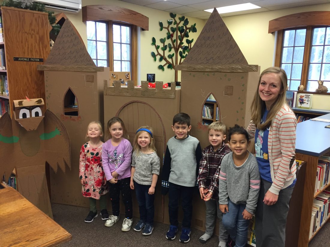 Cardboard Box Day was the theme of a recent story hour class at the Falconer Public Library. Ashley Nelson, story hour director, created a castle for the children out of cardboard. She read Not a Box by Antoinette Portis and Christina Katerina and the Box by Patricia Lee Gauch. The children decorated the walls of the castle with beautiful hand drawn pictures. They made binoculars from cardboard tubes, and, while looking through them, found a fire breathing dragon in the library. They used their imaginations and several props made from cardboard to put out his flames. The children also had a snack with their new dragon friend. Pictured are Nelson and children from the 4-year-old story hour class in front of the cardboard castle.