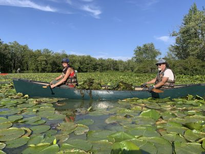 The Audubon Community Nature Center’s Water Chestnut Rapid Response Removal team pulling Water Chestnut plants from the Chautauqua Lake outlet on Aug. 13.