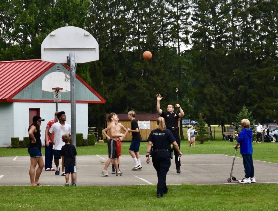 Chautauqua County Sheriff James Quattrone is pictured Tuesday evening at Bergman Park in Jamestown. The sheriff, who was at the park for a public event, was spotted walking up to a group of kids playing basketball before taking a shot at the hoop. He made the basket.