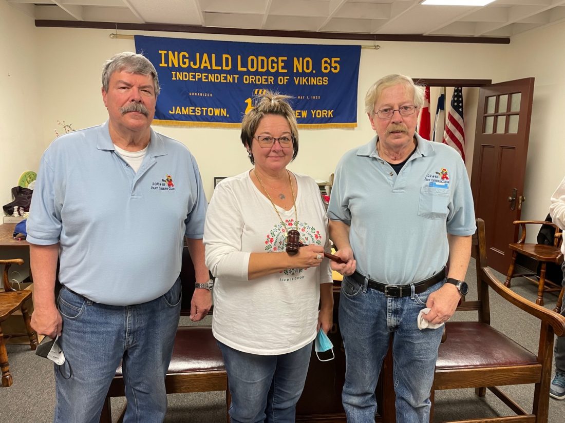 Local Viking Ingjald Lodge 65 elected new officers for 2022. Pictured is newly elected Chief Dawn Stuart receiving gavel from Past I.O.V. Grand Chief Bill Peterson. Past Chief Bryan Nelson assisted in the installation of the newly elected Ingjald Lodge officers.