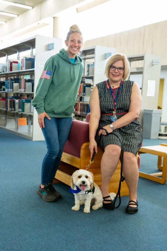 “She’s a love; Clover likes to lean right into you and be petted. She’ll seek out students,” said Kerrie Wilkes, who’s also Clover’s official handler. During three training/observation sessions at the library, Clover was a big hit with patrons. In fact, over 60 students petted Clover in just 45 minutes during one session Wilkes recalled. “It was wonderful!”