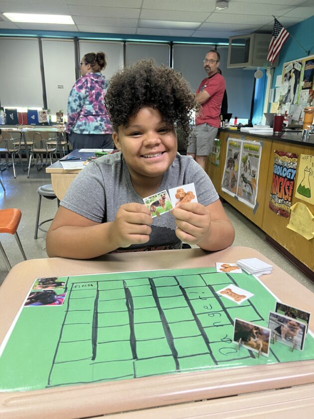 Persell JUMP student, Adrianna Holland, shows off her board game about rescue dogs created as a project-based, summer assignment.
