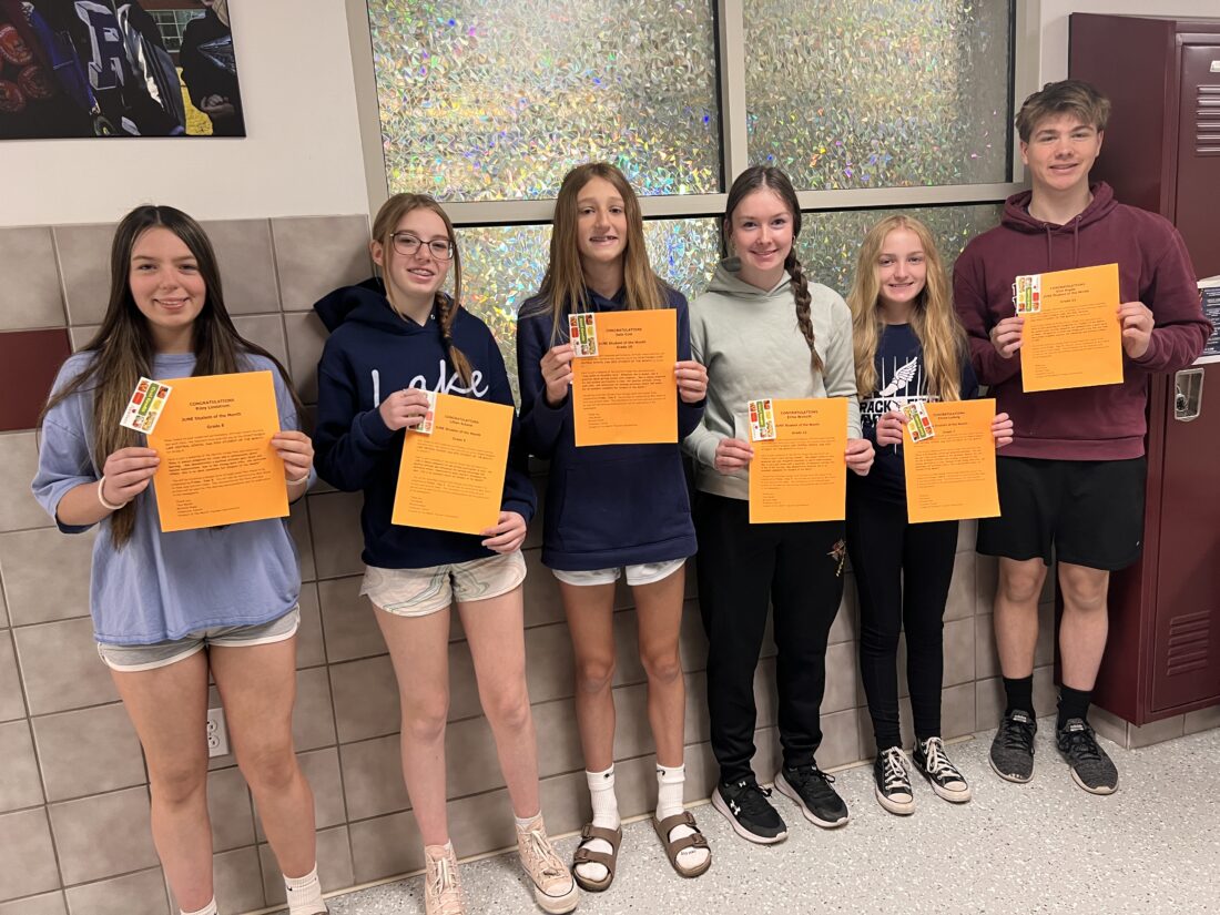 Students of the Month at Chautauqua Lake Central School, honored for June achievements, are Erma Wolcott, Eliot Reyda, Jada Cole, Lillian Schenk, Riley Lindstrom and Eliana Ludwig.