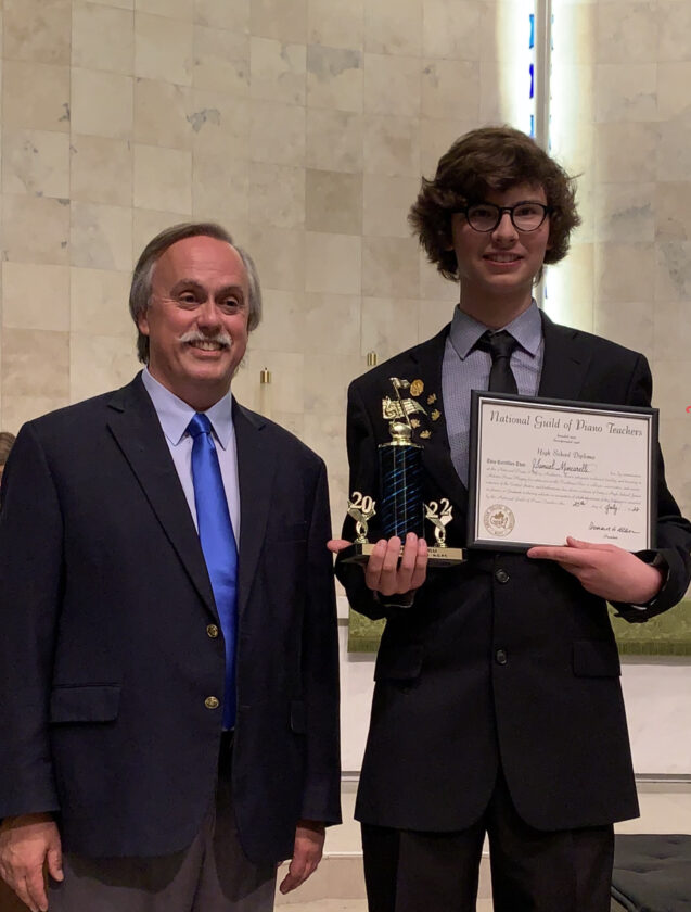 Samuel Mincarelli has studied piano with Andrew Schmidt for six years and will offer his final recital with Schmidt on Friday, July 21, at 7 p.m. at Christ First United Methodist Church, 663 Lakeview Ave., Jamestown. Mincarelli is a 2023 graduate of Southwestern High School and has enrolled to study music composition at New England Conservatory after winning an honorable mention and finalist award from the annual National Guild of Piano Teachers composition contest. Samuel will perform a variety of solo piano music during his final recital ranging from Beethoven to his own compositions. Schmidt and Mincarelli are pictured.