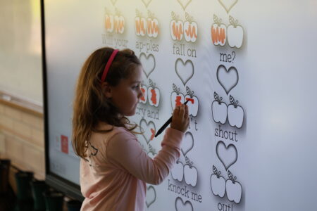 - A Ring School first grader uses the digital white board to detect the beat patterns in a singing game during music class.