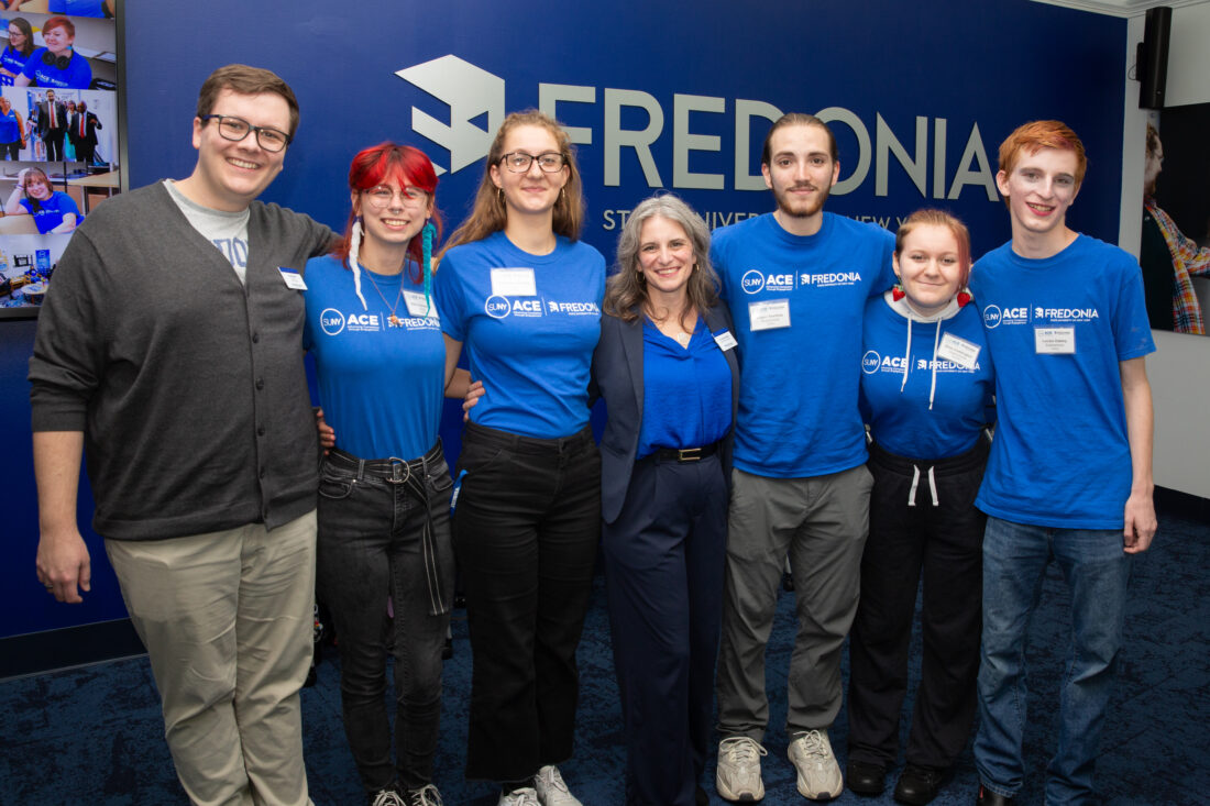 - Participants at SUNY Fredonia’s ACE program announcement, from left, are: ACE Program Advisor Greg Swab, ACE students Nikko Sandgren and Giulianna Lalomio, ACE Program Director Dr. Sue McGee, and ACE students Logan Searfoss, Billie Coddington, and Lucien Oakley.