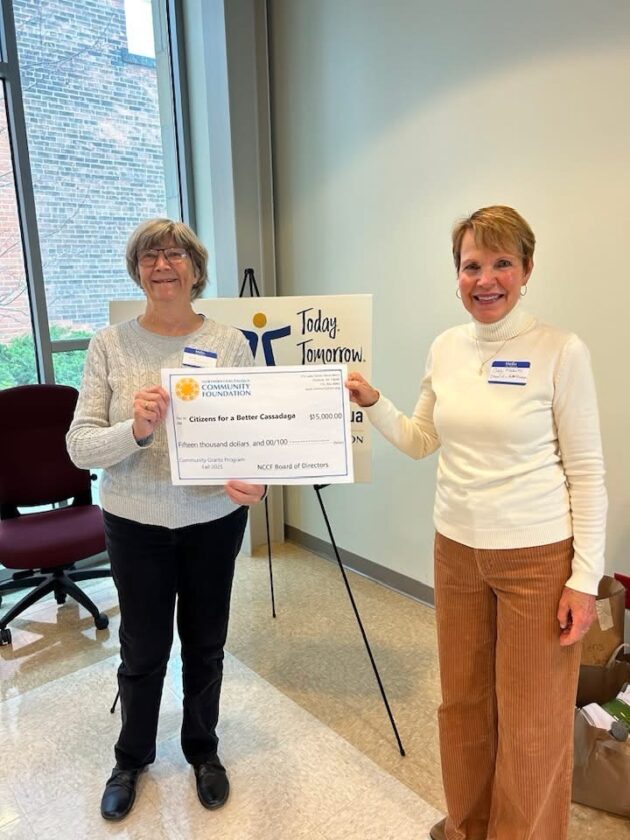 Village of Cassadaga Trustee Cindy Flaherty, right, proudly displays a check for $15,000, presented to the Citizens for a Better Cassadaga by the Northern Chautauqua Community Foundation, to update the gazebo at Cassadaga Beach. Submitted photo