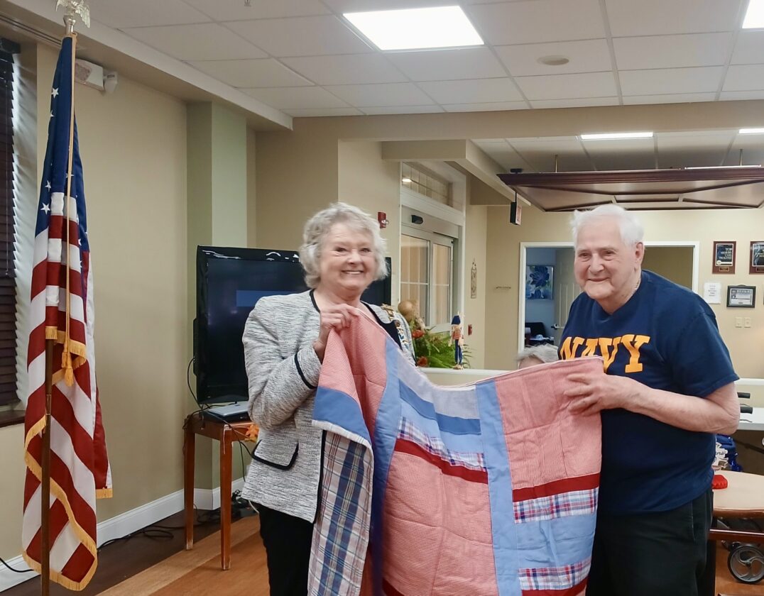 During a Veterans Day celebration recently at Fredonia Place, Fredonia, Dewey Winchell, a 100-year-old World War I Navy veteran received a quilt in honor of his service from Myra Johnston, Regent of the Benjamin Prescott Chapter of the National Society of the Daughters of the American Revolution.