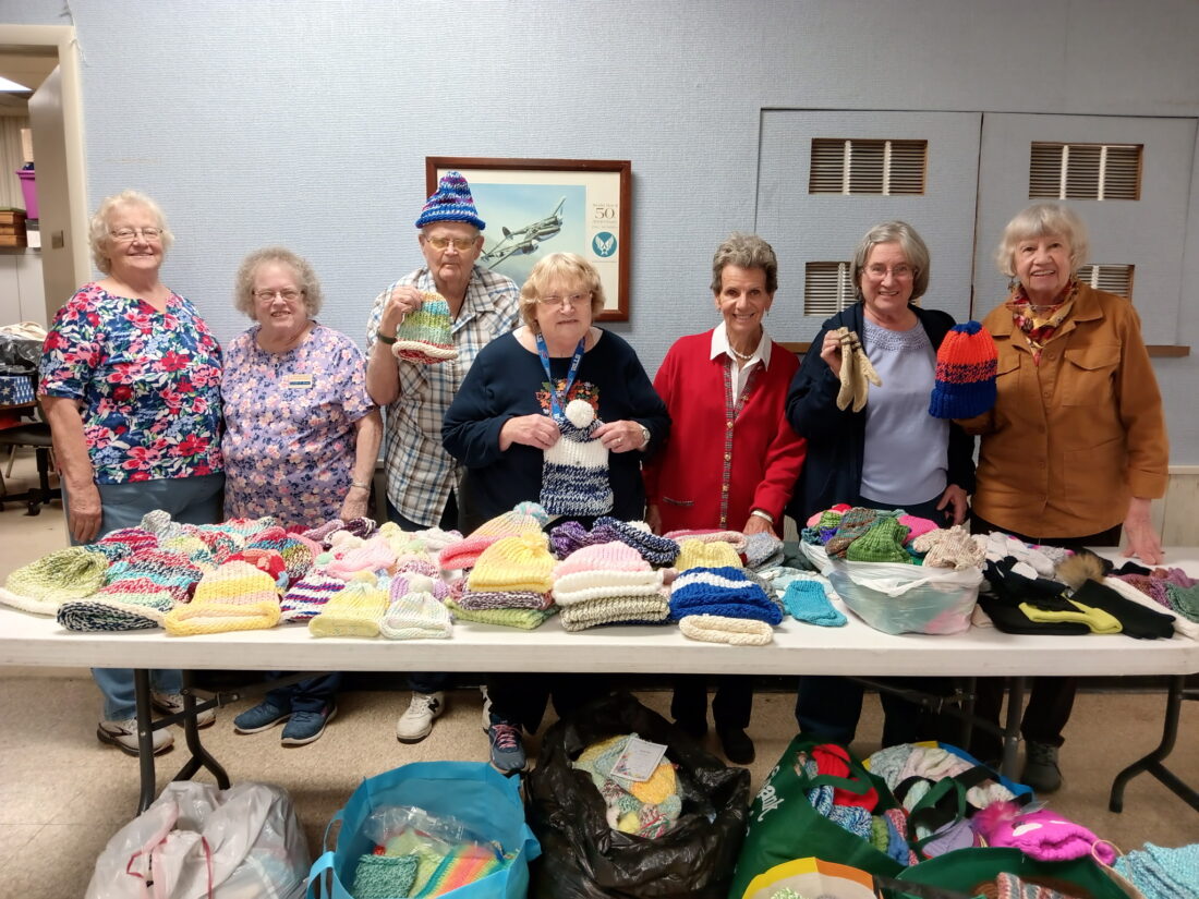 The Lakewood-Busti Golden Agers made 1,518 hats, scarves and mittens for area youth this year. Diane Boland; Claudia Shaw; Richard Hagberg, who made 846 hats; Sharon McCreary, president; Barbra Irons; Carol Samuelson and Rose Prieur, pictured, represented the 18 members who contributed to the donation. Recipient organizations included UPMC Chautauqua Emergency Room and Maternity Care Center, Community Action Organization of WNY (Chautauqua Opportunities, Inc.) Head Start, Jamestown Public Schools, including Lincoln, Love, Fletcher, Ring and Bush elementary schools; Sinclairville Elementary School, Temple Elementary School, Falconer, Lakewood American Legion, Boys and Girls Club of Jamestown, and the Salvation Army. Charlotte Johnson and Julie Bell led the effort and led the distribution.