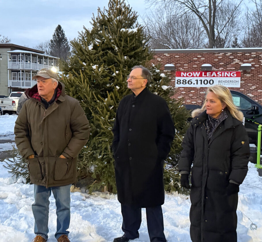 From left, Lakewood Community Development Corp. Vice President Ted McCague, Lakewood Mayor Randy Holcomb and LCDC Project Manager Michelle Turner wait at Summit Street and Chautauqua Avenue for the lighting of the Christmas tree.