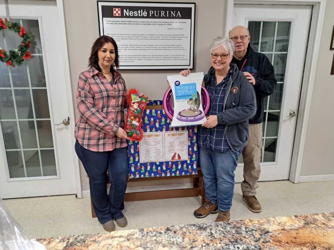 Beth Ray, left, administrative assistant at TRC’s Mary Andrews Center, poses with Barb and Clint Lewis, f Lakeshore Humane Society volunteers, while delivering items collected in Dunkirk.